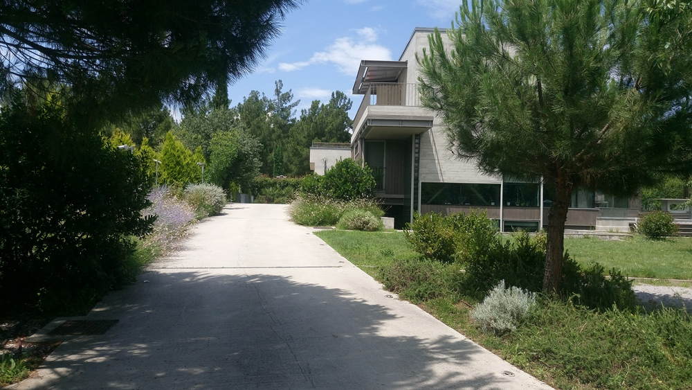Furthermore, create a garden that would reflect the change of seasons and complement the building aesthetics. Selection of plants came from the international Mediterranean climate palette. Around the specific lot there are rather dense formations of pine trees. However, the lot itself, a former pasture, did not feature any pines. The existing almond and wild pear trees were kept as basis for a productive garden situated in the north and east part of the lot that was enriched with, nut shrubs, vegetables and fruit trees. The south part of the garden features the main flower meadows with perennial grasses and the western part of the lot is planted with hardy Mediterranean aromatic shrubs that withstand the summer heat. The configuration reflects the functional rationale that formed the house design as well.
